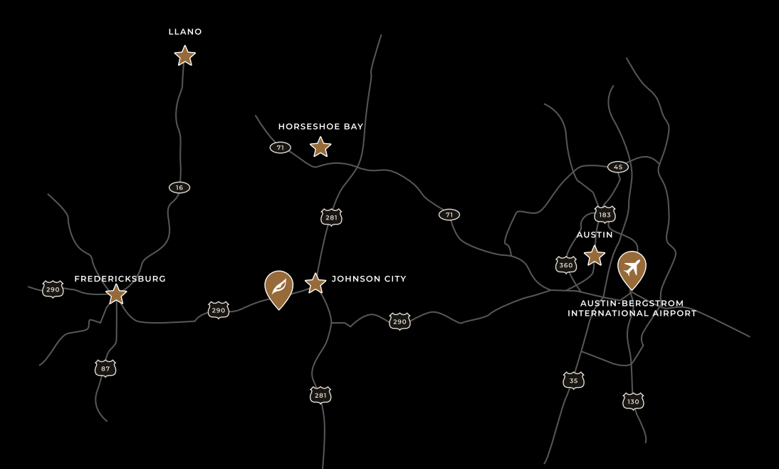 Puerta del Lobo Texas, is located in The Texas Wine Trail / US hwy 290, just 54 miles from Austin, 70.3 miles from San Antonio and 25,2 miles from Fredericksburg.